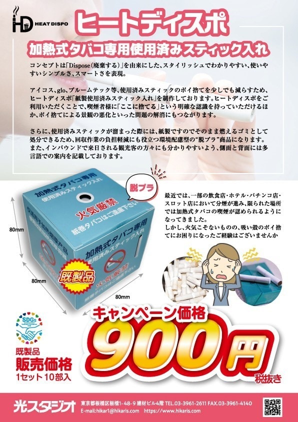 2025.8.27 | 「ヒートディスポ」加熱式タバコ専用使用済みスティック入れの受注販売を始めました。詳しくはこちらから |