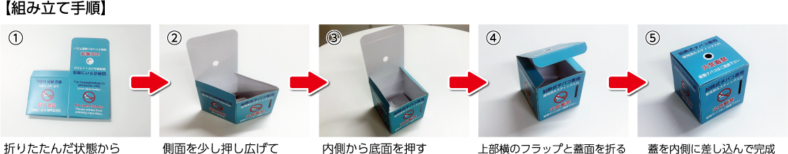 しかし、カラオケ・パチンコ店・スロット店・ビジネスホテル・一部飲食店などで喫煙された際に、「専用の入れ物があればポイ捨ても減り、周囲も清潔に保てる」というご意見を多くいただいております。